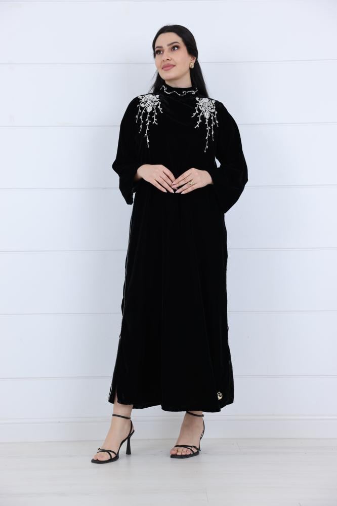 فستان مخمل بتطريز على الصدر فضي لون زيتي