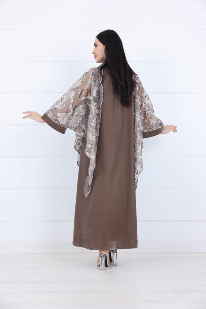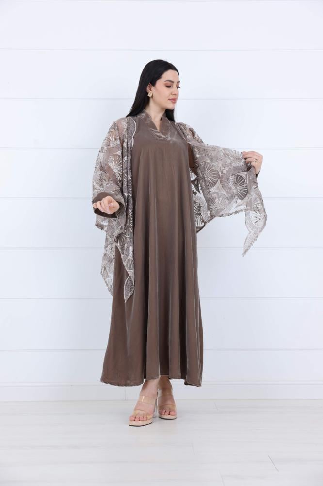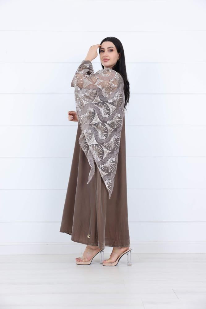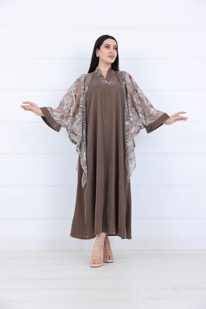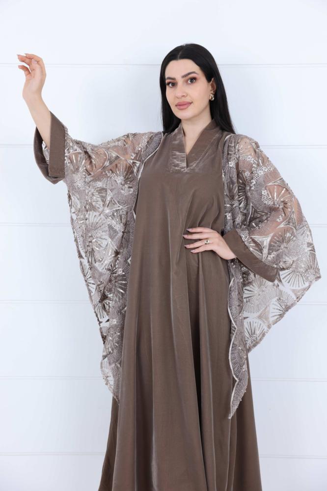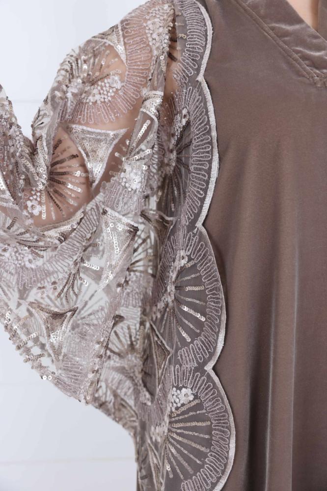 فستان مخمل بكم كلوش دانتيل مطرز لون بيج