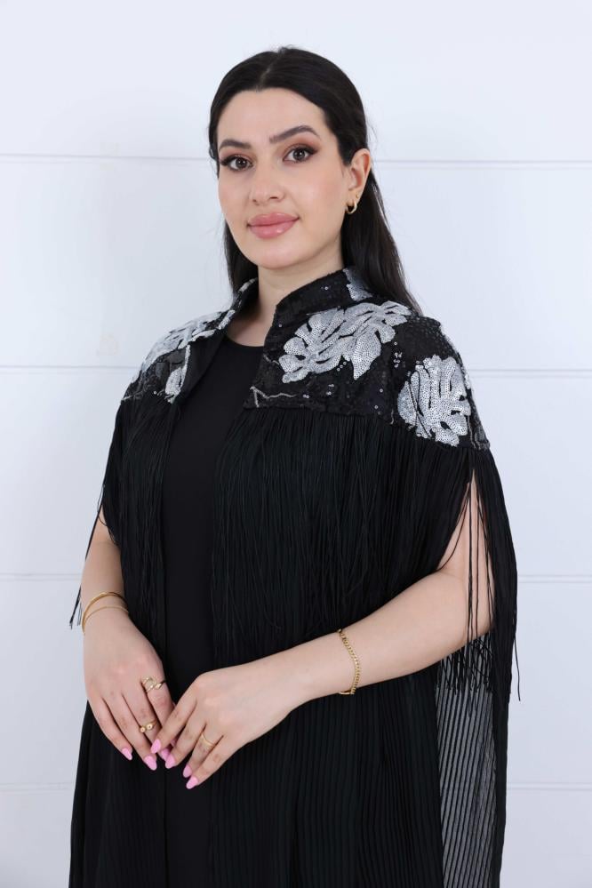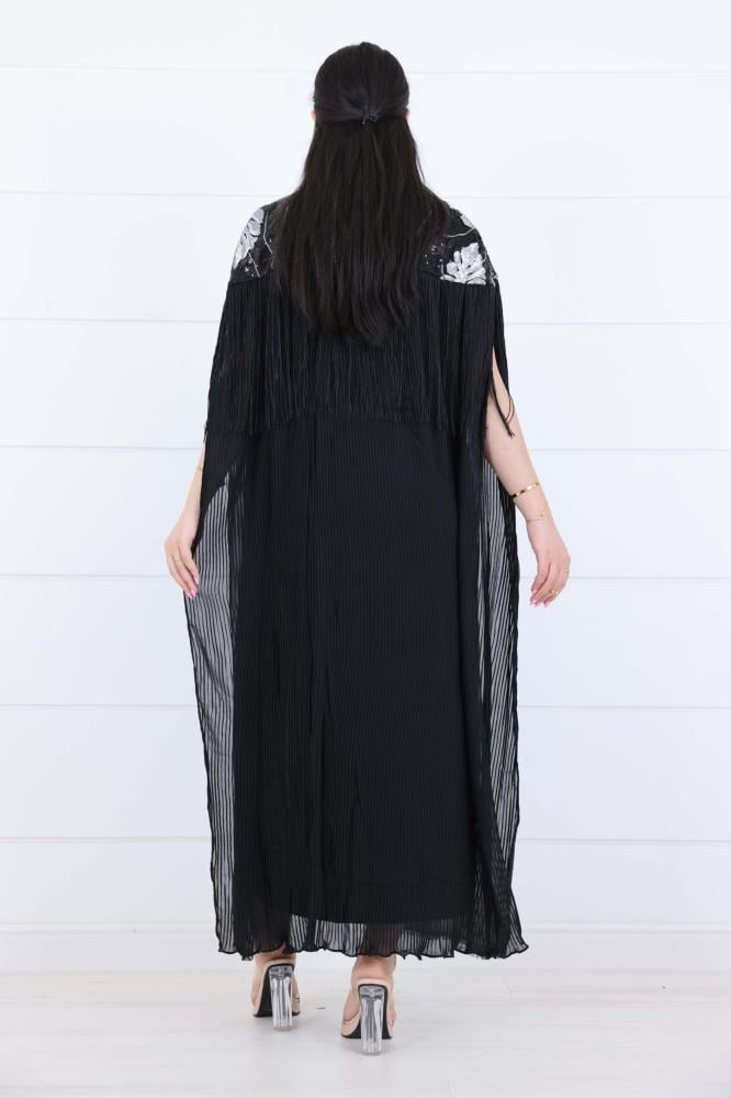 فستان أسود أنيق ومميز يتميز بتصميمه العصري الذي يدمج بين الفخامة والراحة. مع تفاصيل الطرز الفخمة على الكتف والأكمام الطويلة المميزة، يضفي لمسة من الأناقة التي تجعل الفستان الخيار الأمثل للمناسبات الفاخرة.