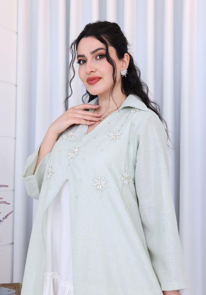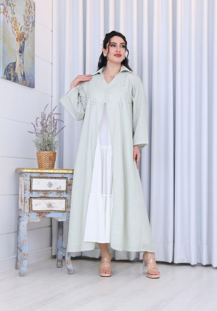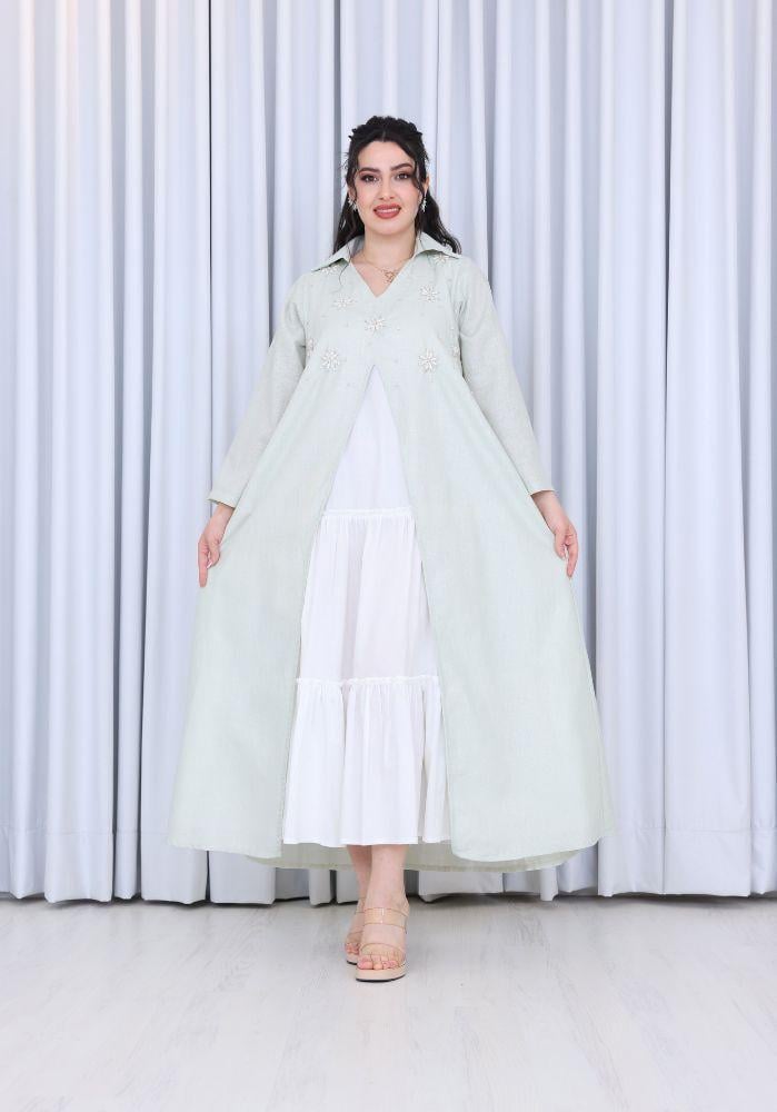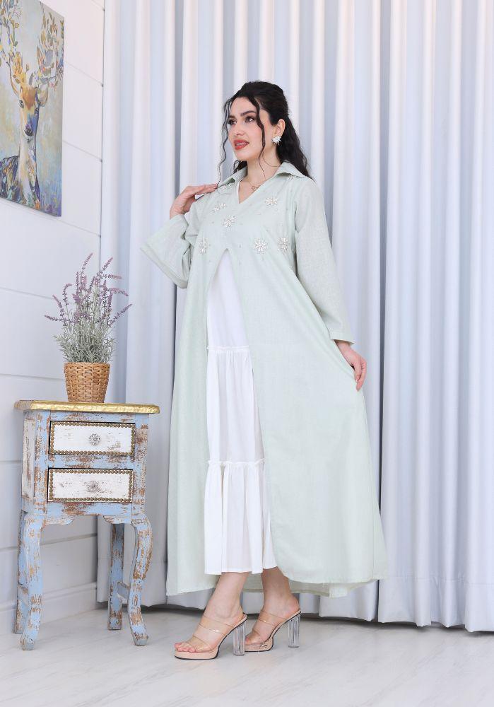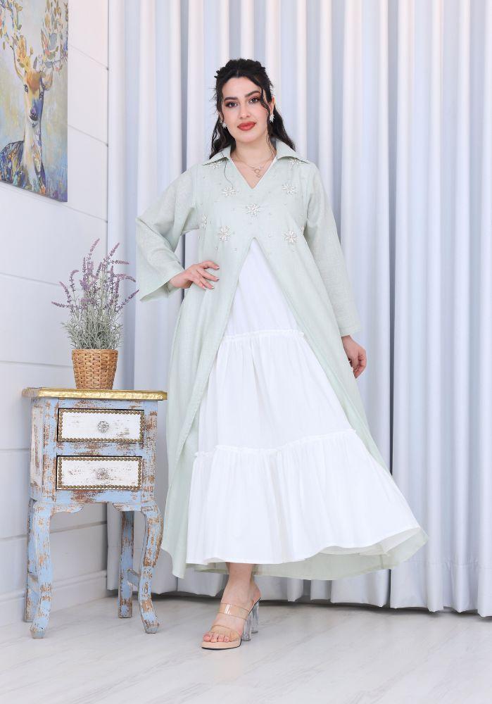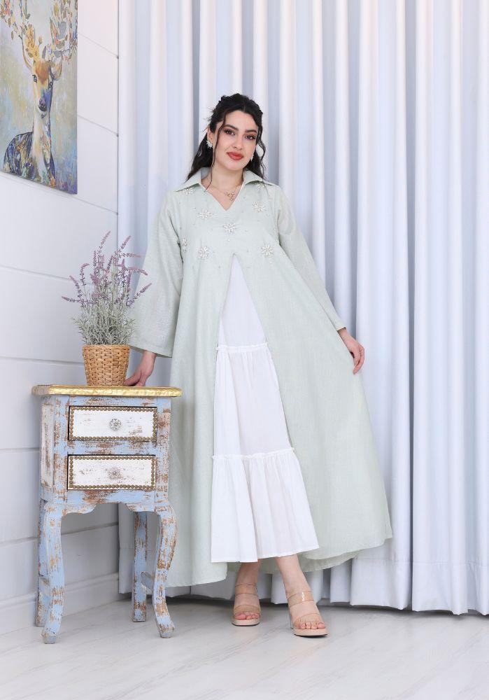 احصلي على إطلالة راقية ومريحة مع فستان نسائي لينن قطعتين برقبة V مزين بشك يدوي على الصدر، الذي يجمع بين البساطة والأناقة في تصميم عصري انسيابي. يتكون الفستان من قطعتين، فستان داخلي ناعم وكاب خارجي مزين بتطريز يدوي فاخر على الصدر يمنحك لمسة من الفخامة والرقي. تصميم مثالي لمناسبات رمضان، الأعياد، والتجمعات العائلية، حيث يمنحك شعورًا بالراحة والتميز في آنٍ واحد.