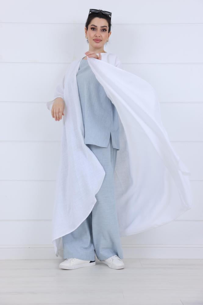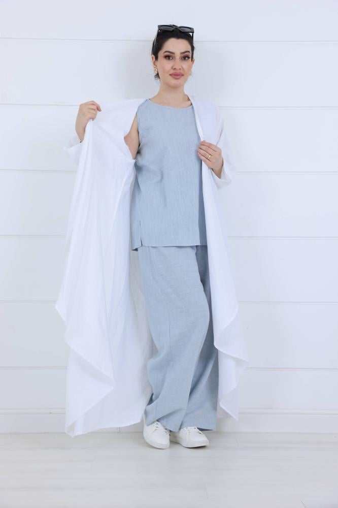 سواء كنتِ رايحة مطار، على طريق سفر، أو طالعة طلعة طويلة… الطقم هذا بيناسبك من أول خطوة لآخر اليوم. عباية كاجوال بلون سكري هادئ، تنسدل بنعومة فوق بنطلون رمادي واسع، والتنسيق بينهم ببساطة "يشرح الصدر"!
