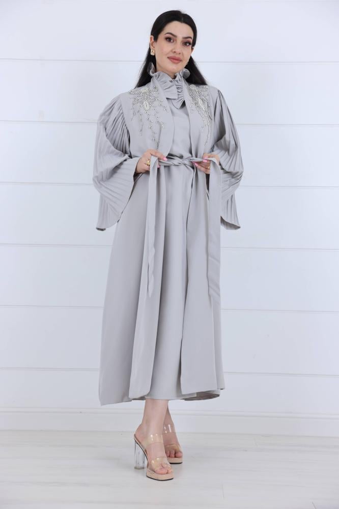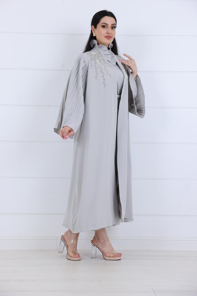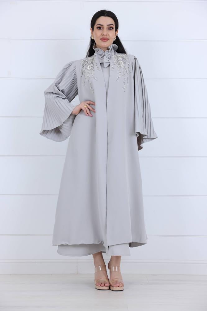 يعد هذا البشت النسائي إضافة رائعة لمجموعتك الملابس الصيفية. يتميز بتصميمه المميز الذي يضفي لمسة أنيقة وأنثوية على مظهرك. تتميز الياقة بالكشكش الذي يضفي على البشت طابعًا جذابًا وأنيقًا. يتم زينة البشت بشك يدوي فضي يضيف سحرًا إضافيًا على التصميم. كما أنه مزين بحبات لؤلؤ لامعة تضفي لمسة لامعة ومميزة على البشت. صمم هذا البشت النسائي ليكون مريحًا ومناسبًا للارتداء خلال فصل الصيف الحار.